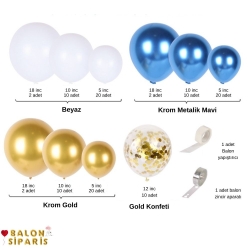 Vergiler Hariç:160,00₺Set İçeriği:-2 Adet 18 inc beyaz balon-10 Adet 10 inc beyaz balon-20 Adet 5 inc beyaz balon-2 Adet 18 inc mavi metalik balon-10 Adet 10 inc mavi metalik balon-20 Adet 5 inc mavi metalik balon-2 Adet 18 inc krom gold balon-10 Adet 10 inc krom gold balon-20 Adet 5..