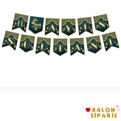 Ramadan Mubarak Kaligrafi Banner 1. Sınıf Metalize kağıttan imal edilmiştir.Ürün uzunluğu 210 cm - yüksekliği 20 cm. Yazı demonte olarak gönderilir.Kutlama başlamadan önce ipten harfleri geçirerek yazıyı hazırlamanız gerekir. Ramadan Mubarak banner süsü kapıya, duvara, perdeye, ağaçtan ağa..